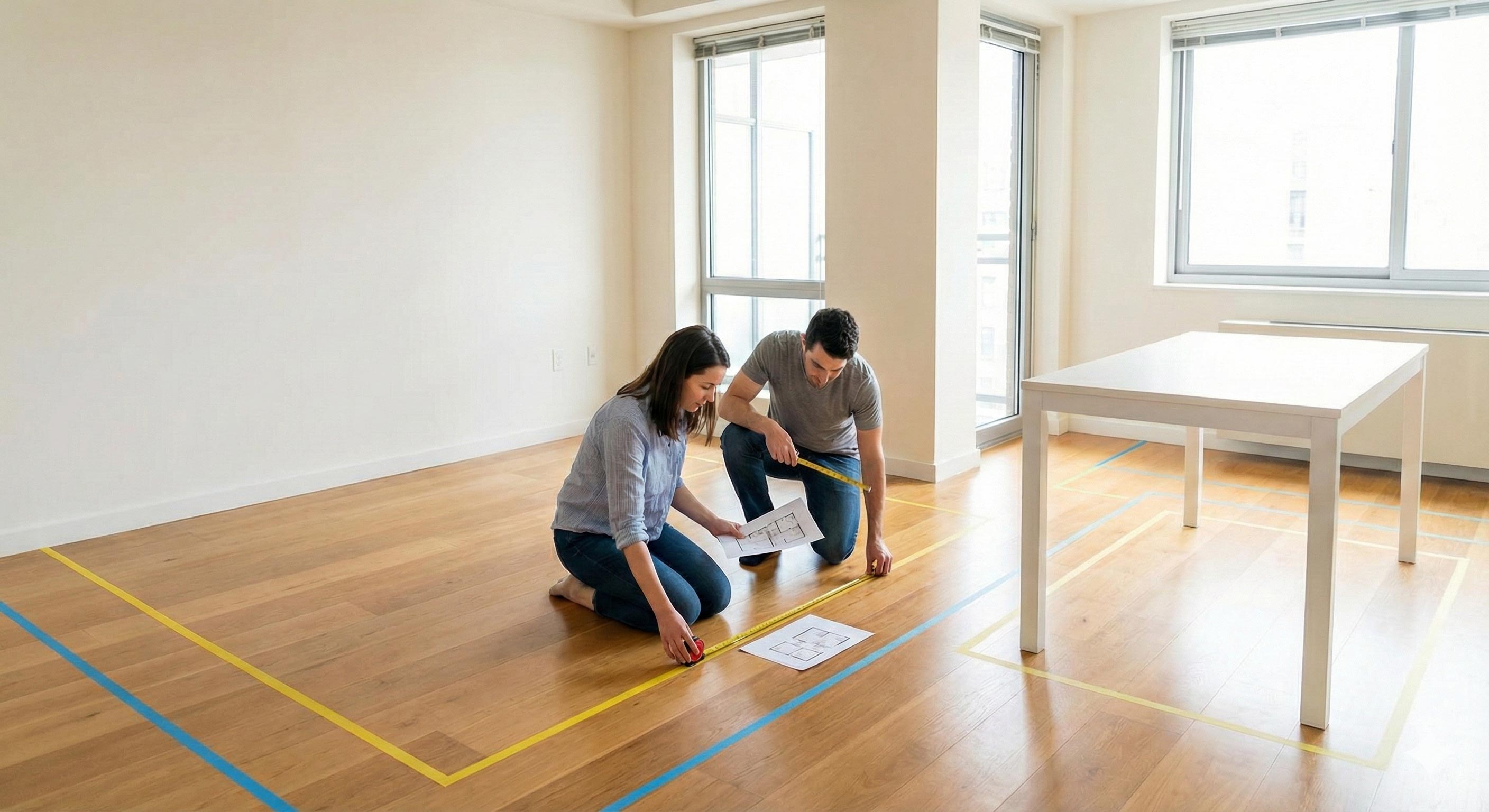好的空間感往往來自「走起來舒服」。你可以先用紙膠帶貼出家具外框,再按順序確認: